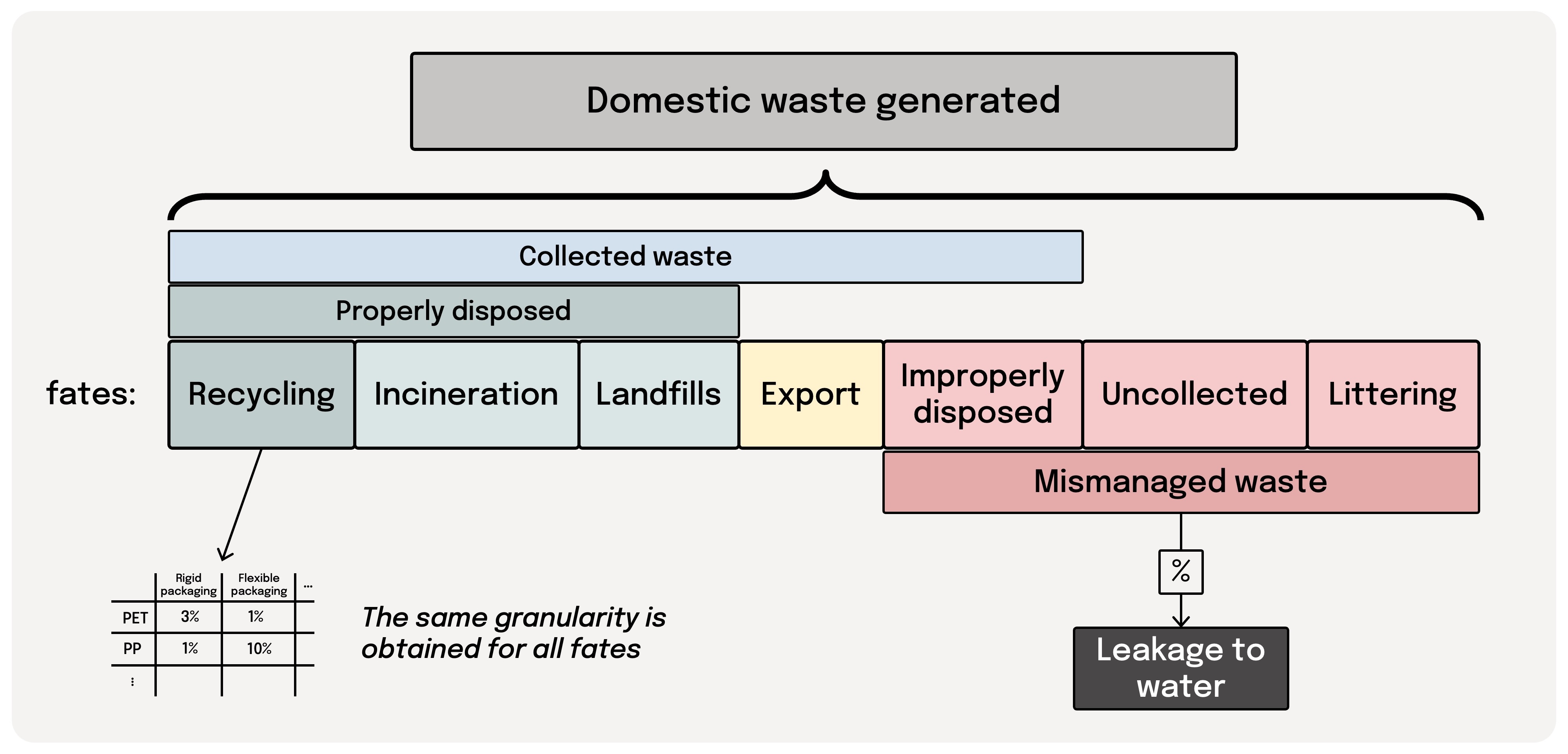 The **model** is the collection of methods and assumptions that allow for the calculation of granular information about the fates of plastic waste. The model is fed with high-quality data about global plastic production and trade, together with the most recent and available information about waste management practices in the countries of interest.&#x20;